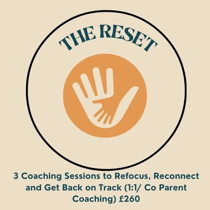 The Reset is 3 x Coaching sessions with Emily to get you back on track and feeling more calm, focused and energised in your parenting. £260 one off payment for 3 hours of coaching (ideally to be done over 3 weeks). For Individuals or couples with Children aged 2- 12 ish)